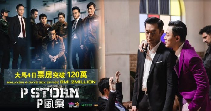 东方影业投资、黄百鸣监製、林德禄执导、古天乐、郑嘉颖、林峯、林家栋、周秀娜等主演的《P风暴》自4月4日大马、香港、内地同日上映后即票房报捷,截至昨日(7/4)。上映4天大马票房突破RM 120万。至于内地更连续4日成为单日票房冠军以及香港亦成为本周华语片冠军。