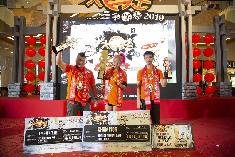 第二届有间面馆全国大胃王争霸赛2019冠军终于出炉啦!来自马六甲的汤美凤(29岁)在最后一个回合中以42秒惊人的速度吃完一碗1.5公斤的汤面以及酱爆丸,成功夺下冠军并将RM16060奖金。