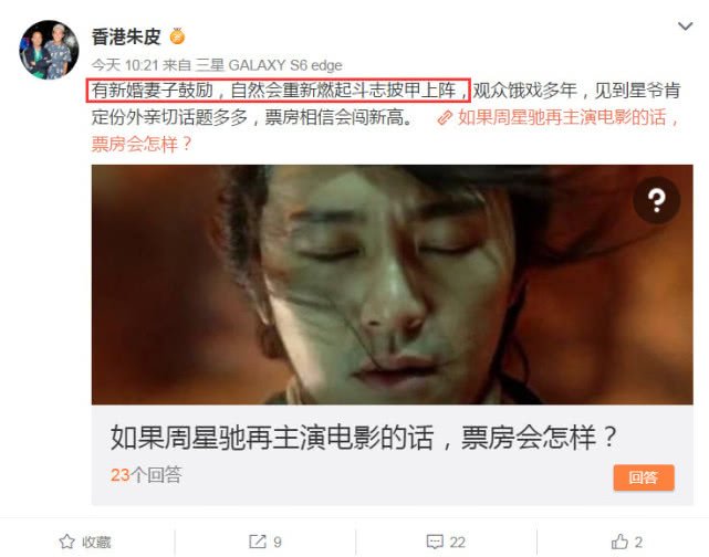 Entertainment娱乐速递 周星驰被曝已经注册结婚!助理这样回复… July 16, 2019 香港娱记在微博回答网友关于星爷的提问时透露:“星爷有新婚妻子鼓励,自然会重新燃起斗志披甲上阵”,疑似间接曝光周星驰刚刚注册结婚的消息。 而在评论下方,也有网友表示:“如果你能放有可信度的照片,我或许就信了”,而对于网友的质疑,该娱记则是表示:“没有如果”,疑似再次确认了周星驰刚刚结婚的事实。对此周星驰助理回复:“假的,希望个别媒体别再博眼球蹭热度!”