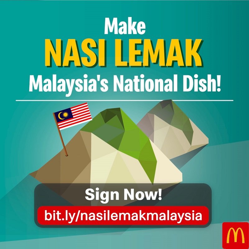 鉴于椰浆饭是马来西亚人最受欢迎的本地美食,马来西亚麦当劳已在Change.org 发起一项全国签名运动,以争取把椰浆饭正式列为马来西亚美食。 麦当劳希望在马来西亚日(9月16日)前收集100万个签名。若要响应这个行动,请点击:http://chng.it/LDfjGDJsQs。