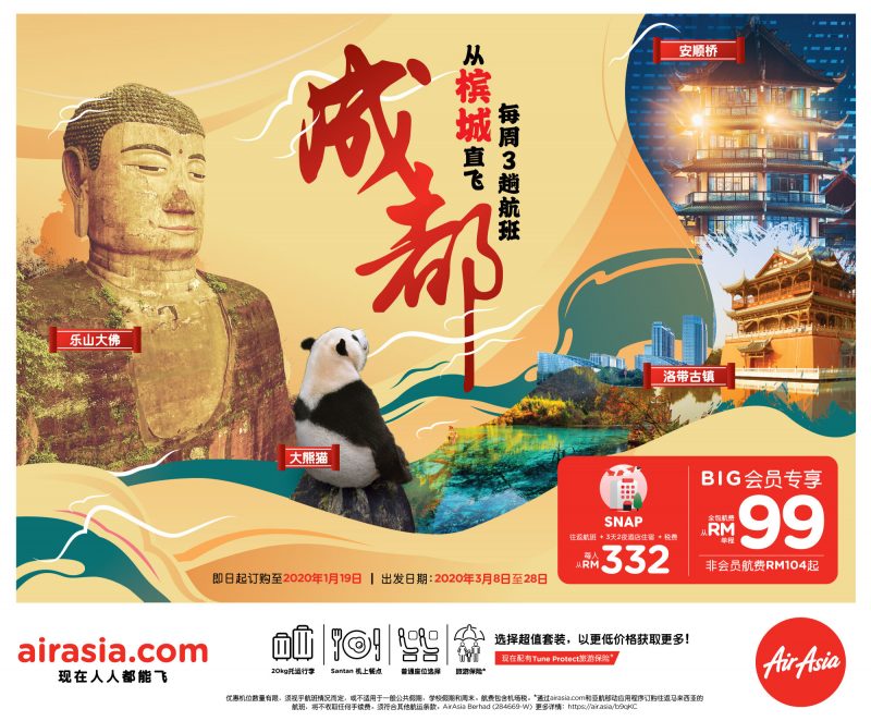 从槟城飞往成都全包会员票价从RM99*起,即日起至2020年1月19日可在airasia.com和亚航手机应用程序预订,出发日期为2020年3月8日至28日之间。浏览airasia.com 抢购来回机票+三天两夜酒店住宿的SNAP配套个人只需RM332**起。