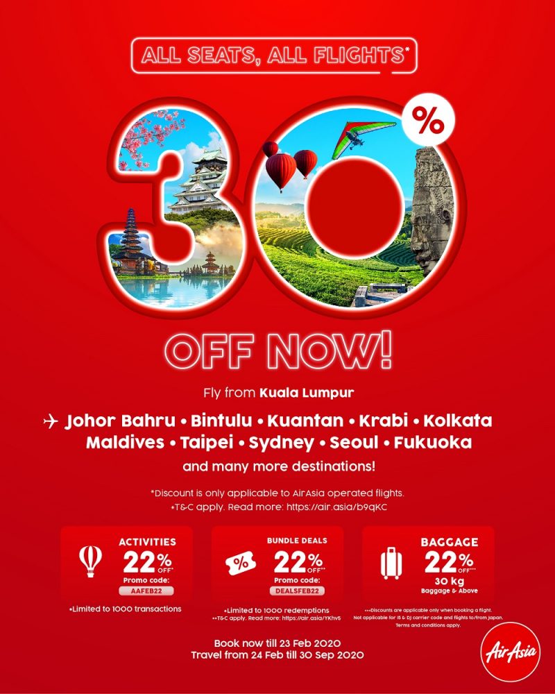 使用优惠代码AAFEB22订购旅游活动配套或使用优惠代码DEALSFEB22订购AirAsia Bundle Deals的首1,000名用户即可享有22%的折扣。