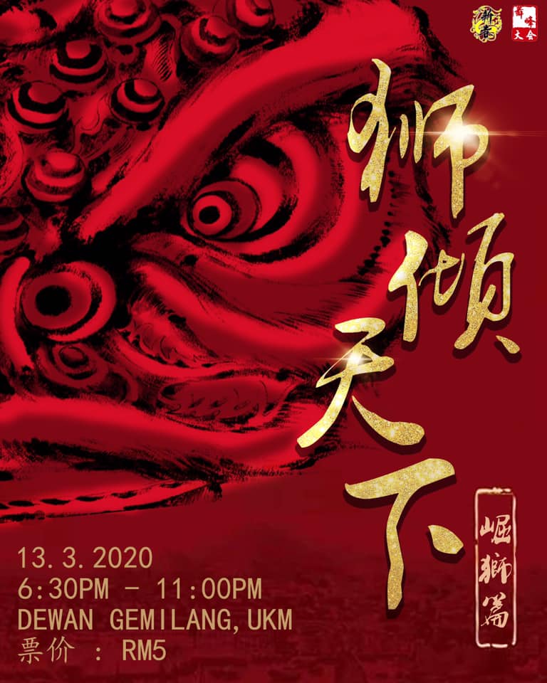 EventsUpcoming Events 国大新春舞峰大会 313将呈现精彩绝伦的狮剧! February 18, 2020 舞狮是华人传统文化中具有重要意义的一项表演艺术,它突显着中华民族文化的魅力和自强不息的精神。 今届舞峰大会崛起了逐渐被遗忘的大头佛。大头佛与南师呈现,配合振奋人心的鼓声,定能给观众带来绝无伦比的视觉与听觉体验,让人也情不自禁地跟着鼓点节奏一起舞动! 不远不近就在Dewan Gemilang UKM,你又怎能错过呢?3月13日国大新春舞峰大会约定你!