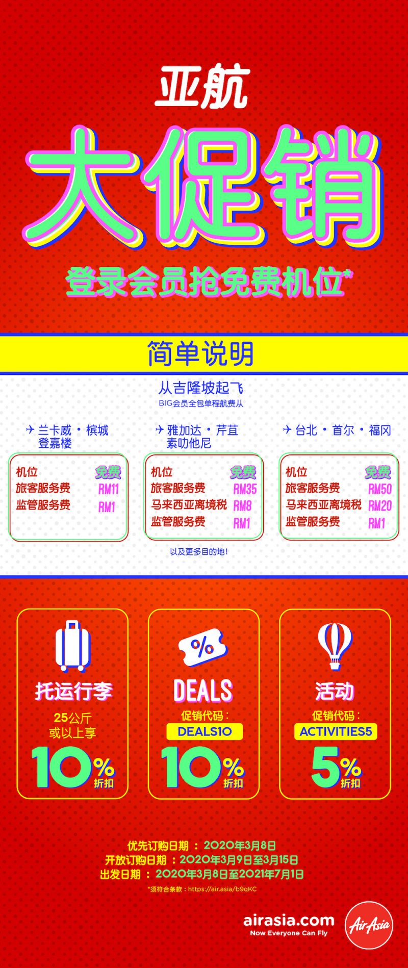 大促销从2020年3月9日(0001h GMT +8)至2020年3月15日(2400 GMT +8)在airasia.com与亚航手机应用程序开放予公众订购。