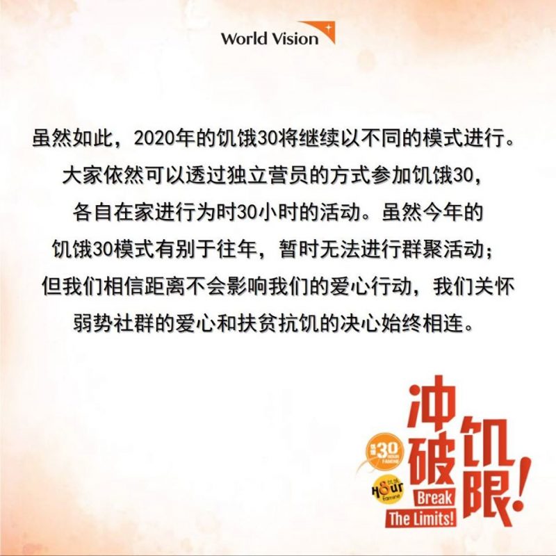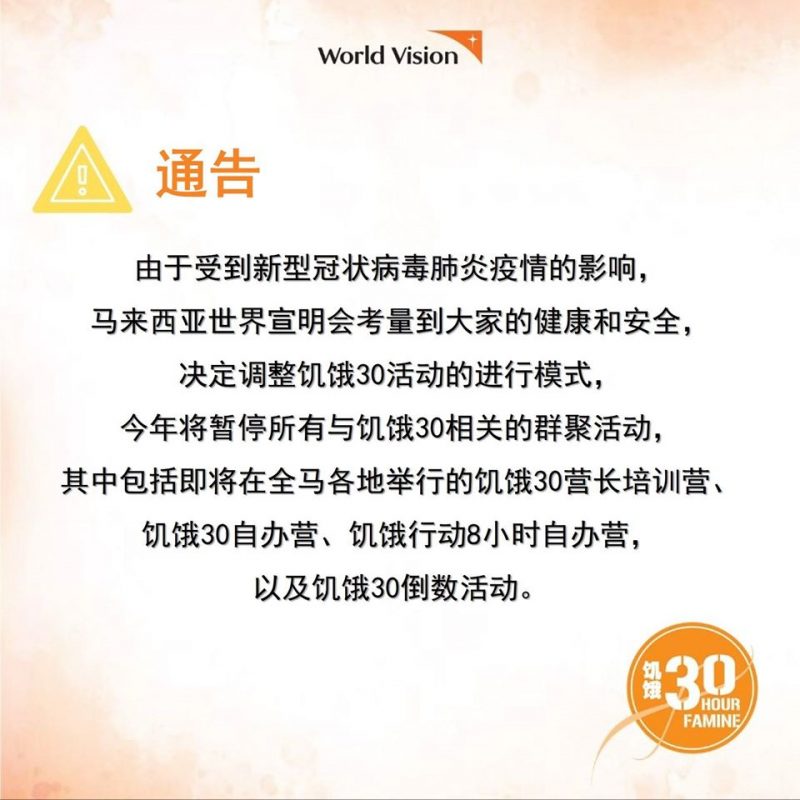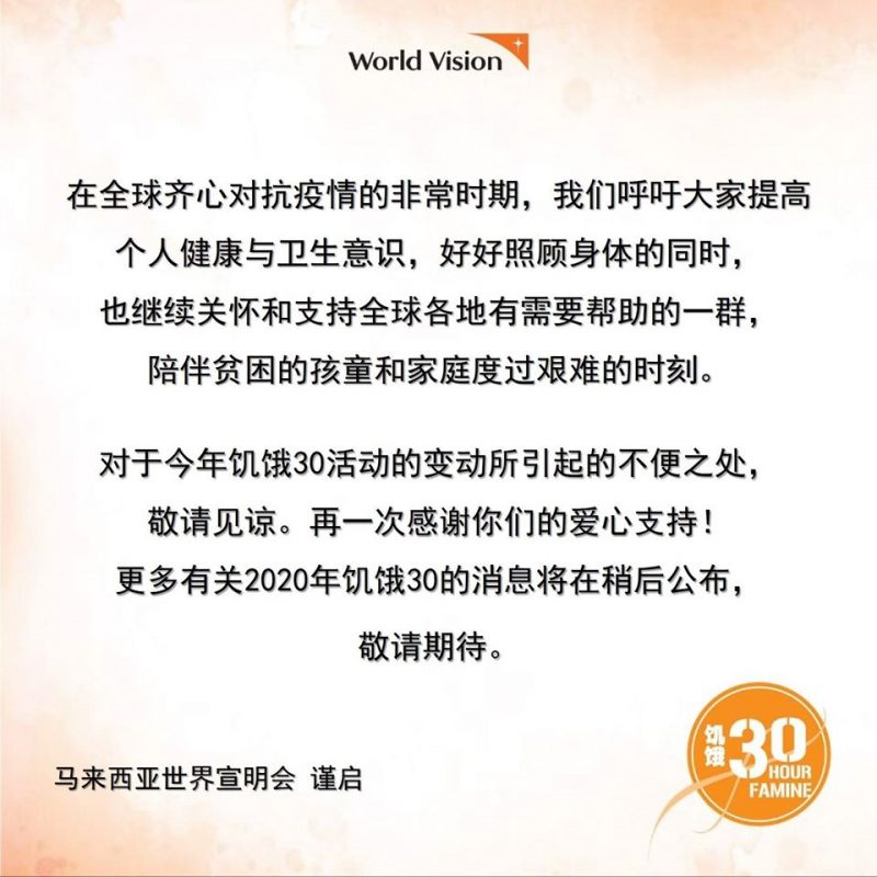 Entertainment娱乐速递 周兴哲不来了?2020年饥饿30暂停所有群聚活动! March 18, 2020 由于受到新型冠状病毒肺炎疫情的影响,马来西亚世界宣明会考量到大家的健康和安全,在今日(18日)于官方脸书宣布今年将暂停所有与饥饿30相关的群聚活动,其中包括即将在全马各地举行的饥饿30营长培训营、 饥饿30 自办营、饥饿行动8小时自办营,以及饥饿30倒数活动。 对于今年饥饿30活动的变动所引起的不便之处,敬请见谅。再一次感谢你们的爱心支持!更多有关2020年饥饿30的消息将在稍后公布,敬请期待!