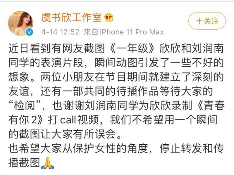 昨日虞书欣工作室发出声明,表示该表演片段的截图引起了一些不好的印象,虞书欣和刘润南也在节目期间结缘成为好朋友。在虞书欣参与《青春有你2》时,刘润南也专门录制视频为她打call,不希望大家因为一个截图而引起误会,“也希望大家从保护女性的角度,停止转发和传播截图。”