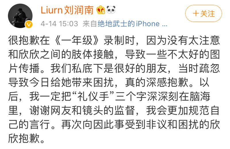 随后刘润南也发文道歉,表示两人私底下是很好的朋友,因为当时的疏忽导致今日给她带来困扰,深感抱歉。“以后,我一定把“礼仪手”三个字深深刻在脑海里,谢谢网友和镜头的监督,我会更加规范自己的言行。再次向因此事受到非议和困扰的欣欣抱歉。”