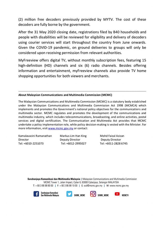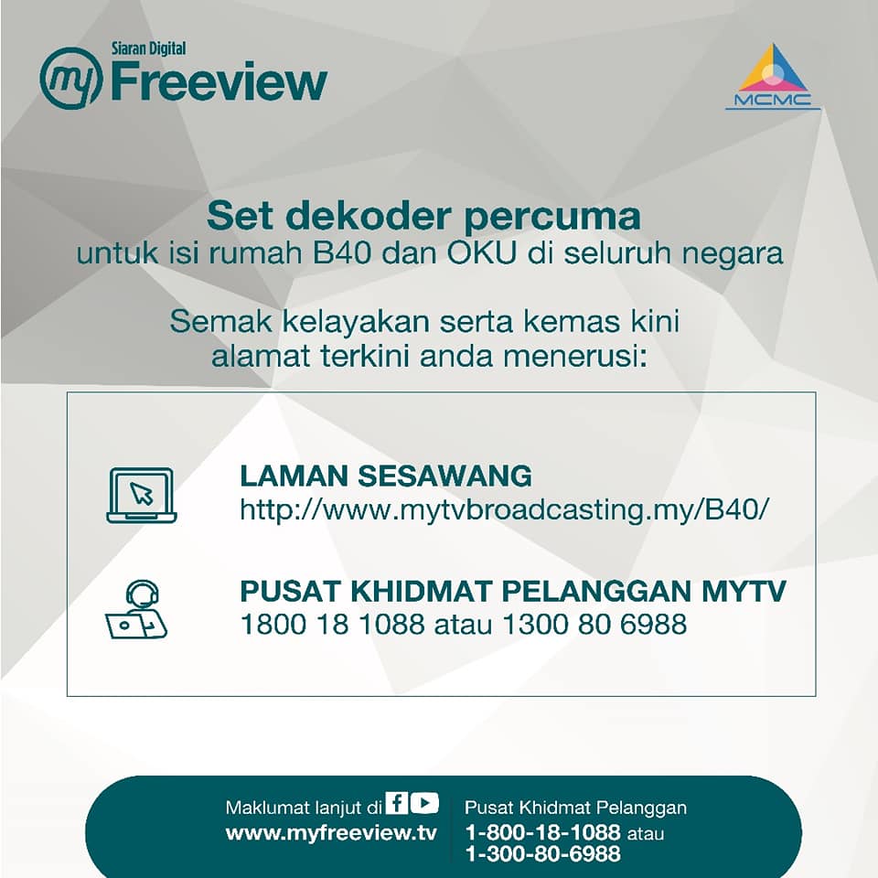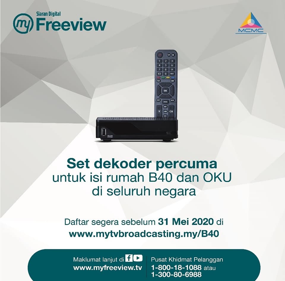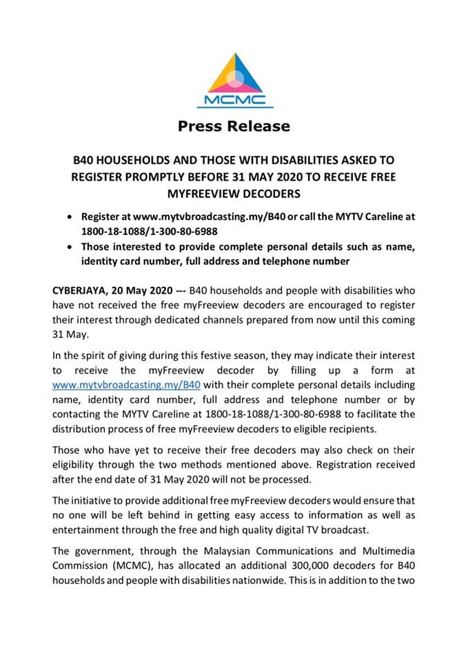 20日,马来西亚通讯及多媒体部发出了文告表示,还未获得免费电视解码器的B40群体及OKU人士,需在5月31日前通过相关渠道作出申请,以确保可以获得政府免费派发的电视解码器。