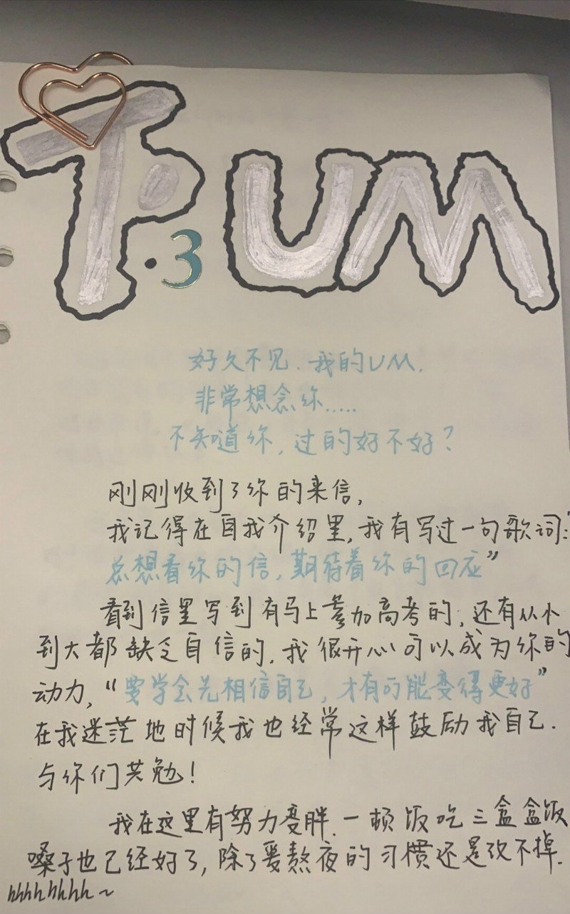 好久不见,我的UM,非常想念你…不知道你,过的好不好?刚刚收到了你的来信,我记得在自我介绍裡,我有写过一句歌词:“总想看到你的信,期待著你的回应”