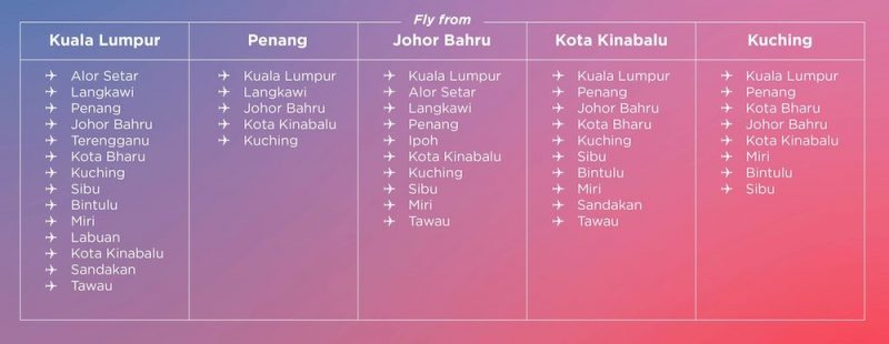 无限通行证可用于马来西亚国内16个航点无限次飞行,包括亚罗士打、兰卡威、槟城、怡保、新山、吉隆坡、哥打巴鲁、瓜拉登嘉楼、古晋、美里、民都鲁、诗巫、亚庇、山打根、斗湖和纳闽。