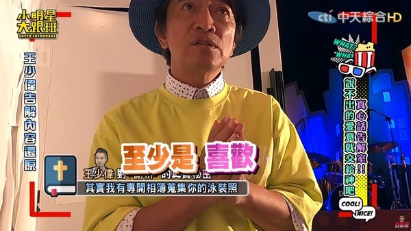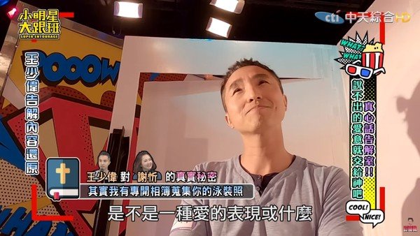 在10日播出的《小明星大跟班》中,王少伟坦承手机中存了不少谢忻的性感泳装照,因对方自风波后,变得更有女人味了,身边也有不少人传她的照片给他,所以他就开始收集照片。对此,吴宗宪表示,若只是一般的工作伙伴,应该连一张普通的生活照都不会存,何况是搜集对方的性感泳装照。