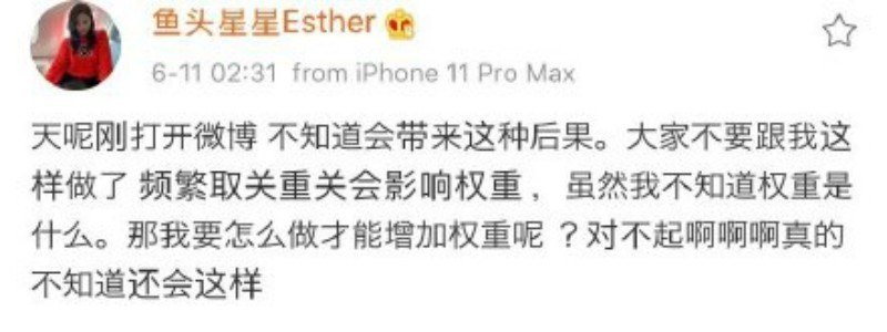 在凌晨2时30分时,虞书欣的小号在微博发文并晒出粉丝的私信,写道:“天呢刚打开微博,不知道会带来这种后果。大家不要跟我这样做了,频繁取关重关会影响权重,虽然我不知道权重是什麽。那我要怎么做才能增加权重呢?对不起啊啊啊真的不知道还会这样”。