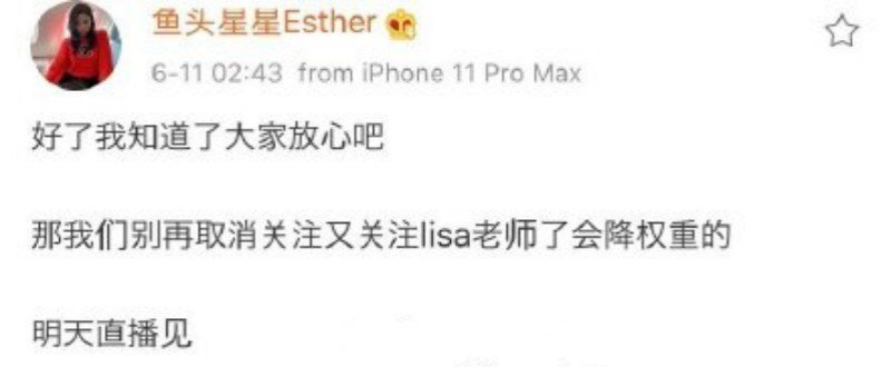 大约过了十分钟,她再次发文表示 “好了我知道了, 大家放心吧,那我们别再取消关注又关注lisa老师了会降权重的,明天直播见”。