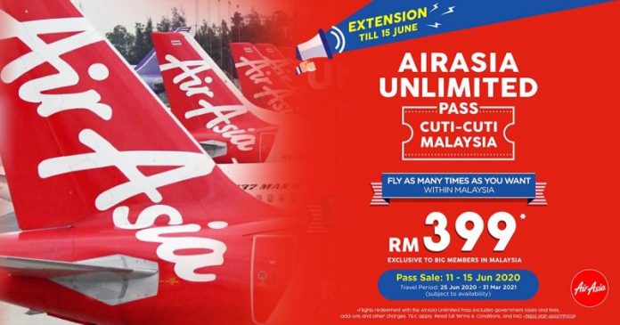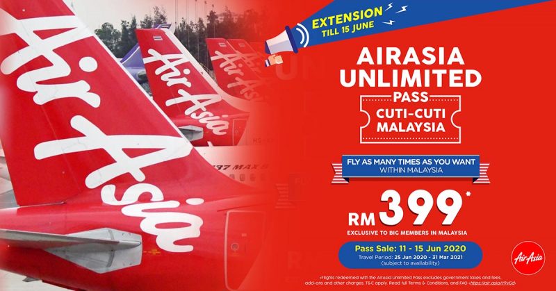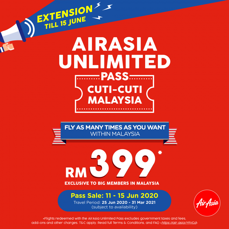 鉴于销售反应热烈,亚航将宣布将Unlimited Pass Cuti-Cuti Malaysia(无限通行证)促销延长两天至2020年6月15日 (2359h GMT+8)。