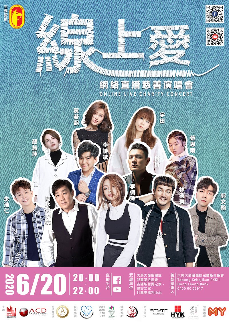 在全球实践新常态之时,紧扣时代脉搏,网路直播成了演唱会进行的最佳平台。由雪兰莪马会赞助、阿水影音制作公司策划主办、亚洲文化发展有限公司策划协办、大马大爱脑伤症儿童基金协会惠款协办、活动主席丹斯里拿督詹学龙、副主席林辉明(苗大师)、总策划阿水黄得伟,倾力主办一场线上慈善演唱会,为本地弱势团体筹募抗疫经费,缓急相济。