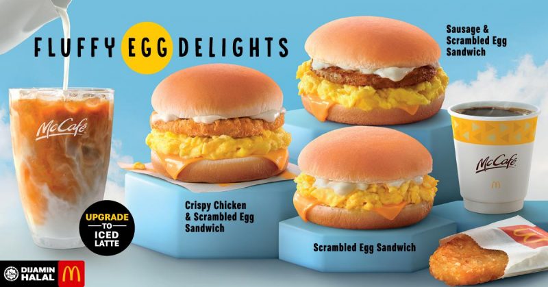 McDonald’s此次除了推出新汉堡、派及甜品外,还有早餐系列的饮料升级哦!一些列的蓬松炒蛋三明治加上香脆的马铃薯饼,再配上一杯冰拿铁,绝对能够为你带来更大的满足感!