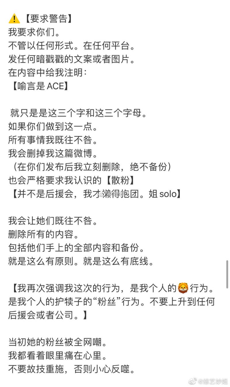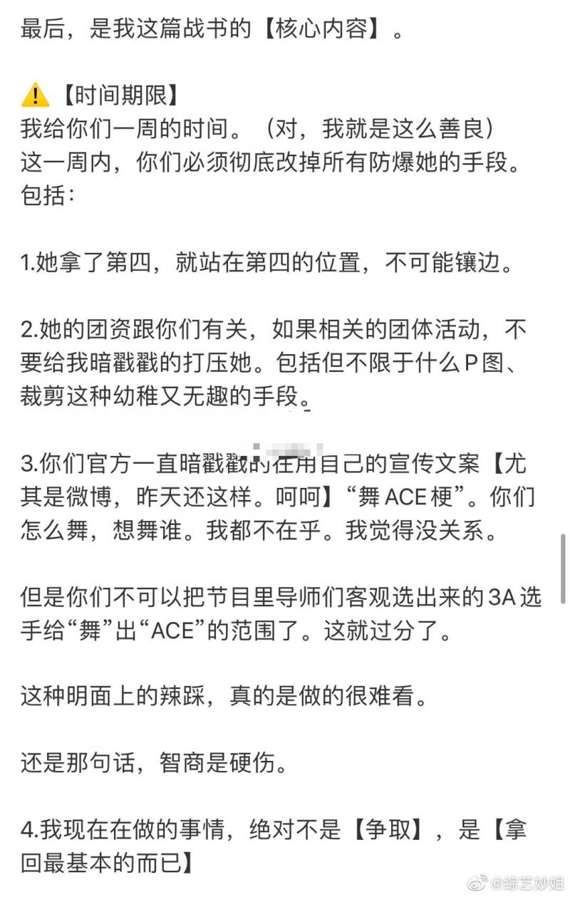 该名自称是喻言粉丝的网友昨日(21日)凌晨在微博发一篇约千字的长文,认为喻言是全能型的唱跳艺人,但是节目组自开播以来不断防爆喻言的操作让她感到极度不满,以“小学生”和大言不惭的语气来命令和要求所有平台在一周内改掉防爆喻言的手段,还警告在任何关于喻言的文案或图片注明“喻言是ACE”。