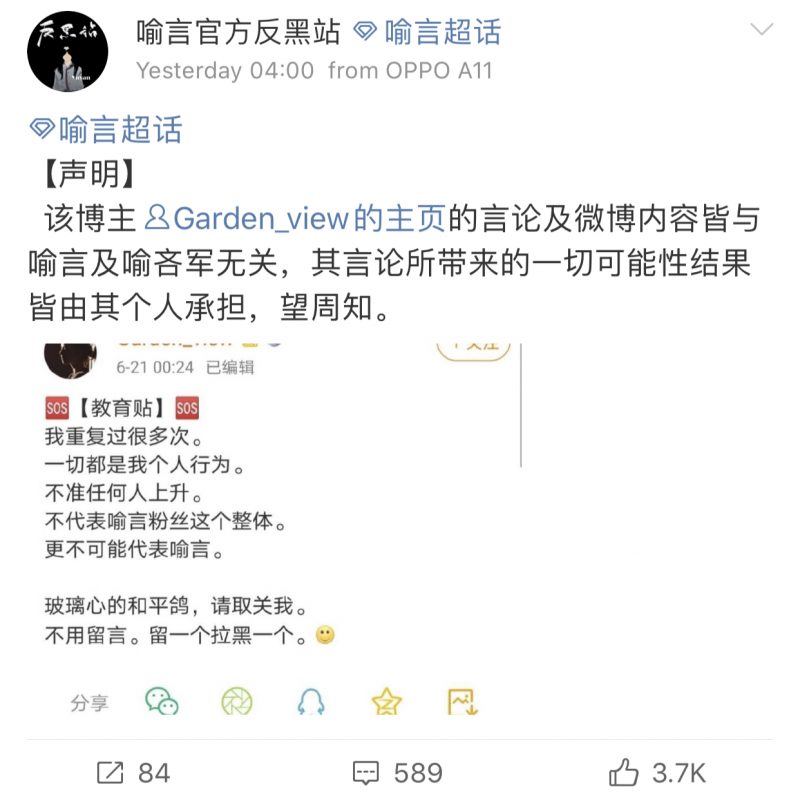 喻言反黑后援会马上就挂出这位“粉丝”的账号,表示他的言论不代表喻言以及自家粉丝群体喻吝军。