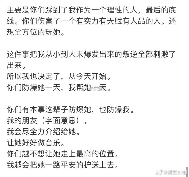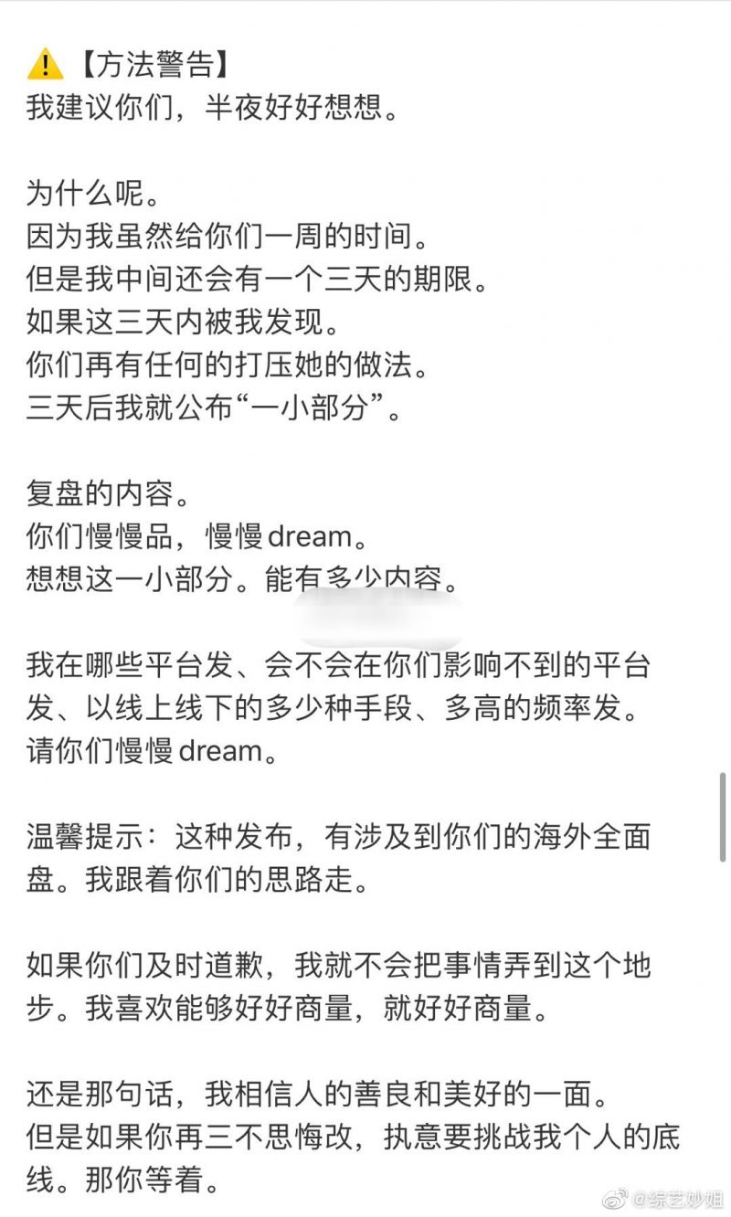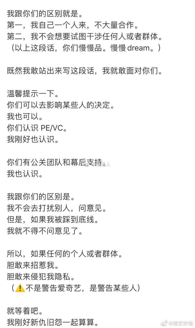 该网友在长文中也炫耀自己的社会地位和强大的人脉关系,表示自己可以影响投资者的决定,圈内人脉资源也很广,对娱乐圈的各类套路都非常了解,“你们有公关团队和幕后支持,我也认识”。