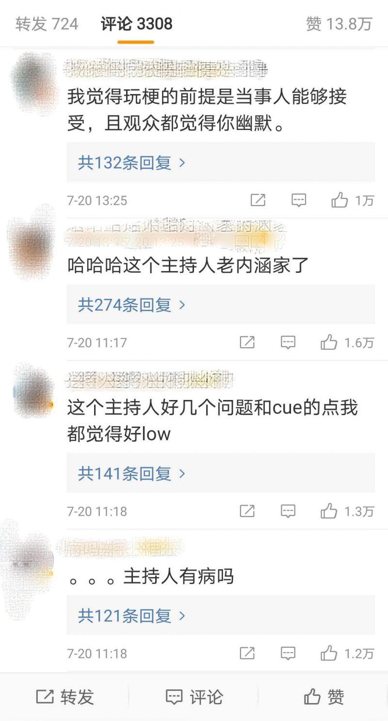 网友们看了该片段后,都纷纷批评该名主持人“太low了”、“她总去提问人家比较尴尬的事情,弄得嘉宾语塞,就看着挺无语”。此外,也有网友扒出这位主持人已经不是第一次这样了,在之前的极限挑战直播时,这位主持人打断了THE9谢可寅的发言,还直接把话筒拿走,一句道歉也没有,让谢可寅尴尬的站在原地。