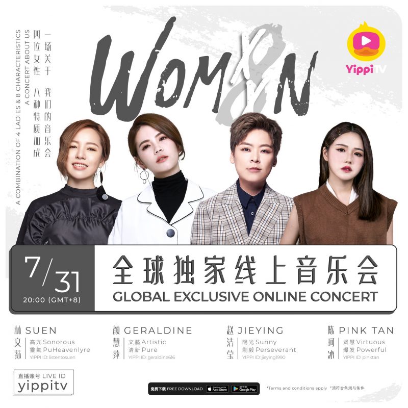 4 位大马实力派唱将 Pink Tan 陈珂冰、Suen 林文荪、JieYing 赵洁莹以及Geraldine 颜慧萍,将于来临的 7 月 31 日星期五合力举办一场 「WOMXN」女力直播音乐会,在直播平台 YippiTV official 接力开唱。