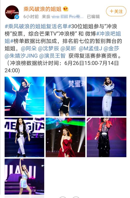 据悉,这次的复活赛名单是综合芒果TV冲浪榜和微博冲浪吧姐姐榜单数据比例加成,排名前7位的暂别舞台的姐姐。