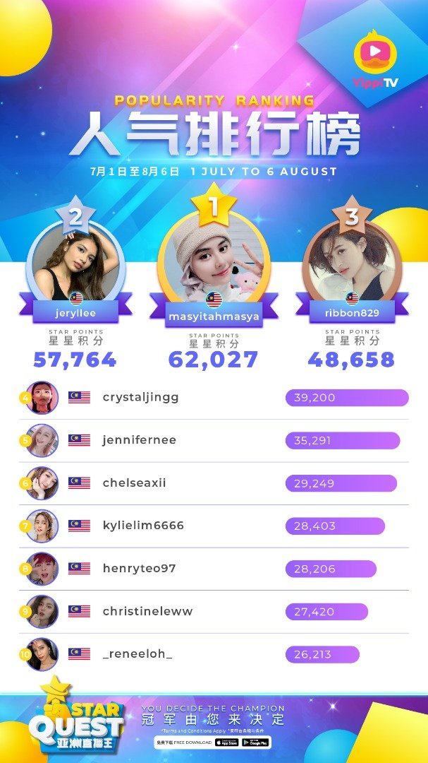 巫裔女歌手Masya玛莎在《Star Quest亚洲直播王》120强预选中,成功“抢”下第一名,Jeryl李佩玲被挤下榜首地位,如今排在第二名,另一女艺人Ribbon黄若熙则排名第三!