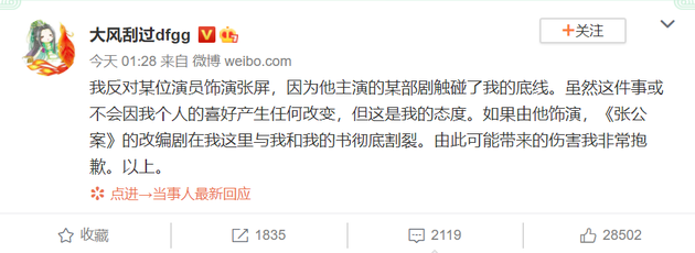 她发文表示:“我反对某位演员饰演张屏,因为他主演的某部剧触碰了我的底线。虽然这件事或不会因我个人的喜好产生任何改变,但这是我的态度。如果由他饰演,《张公案》的改编剧在我这里与我和我的书彻底割裂。由此可能带来的伤害我非常抱歉。”