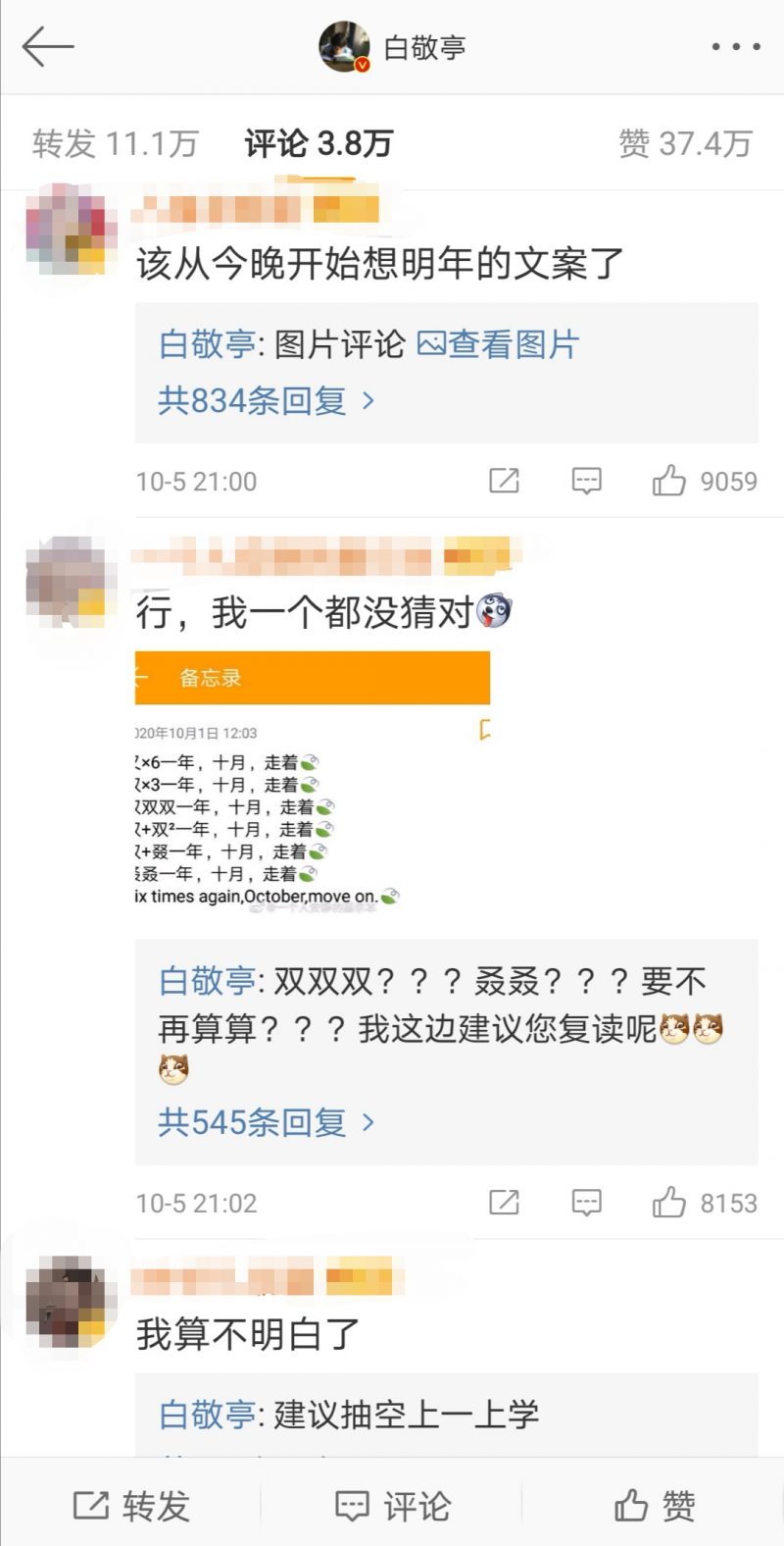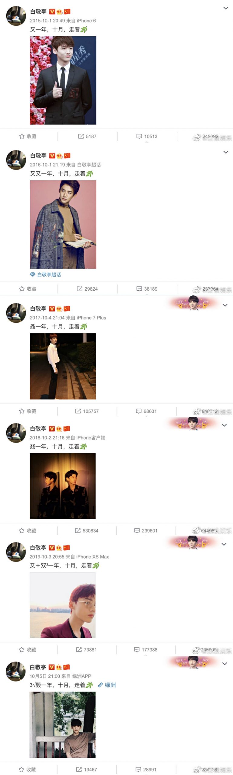 每年十月初,白敬亭都会在微博上发一条关于十月的文案,这一发就是六年。虽然每年发的都是“又一年,十月,走着”,但是文里面的“又”字却是每年都不一样!