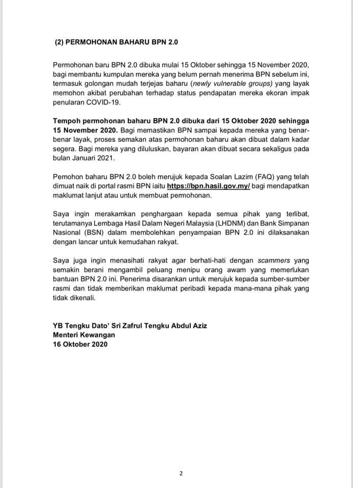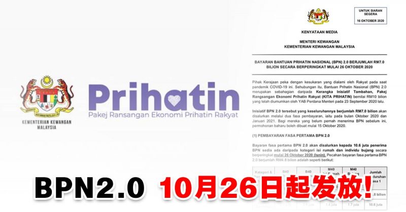 Lifestyle生活资讯 【国家关怀援助金BPN 2.0】10月26日起分阶段发放! October 16, 2020 国家关怀援助金(Bantuan Prihatin Nasional/BPN)2.0,将于10月26日起分阶段发放! 需注意的是,早前成功获得BPN的受惠者无需再次提出申请,将自动获得BPN 2.0;至于符合资格但从未获得援助金的民众可从10月15日开始提出申请。 完整常见问题解答(FAQ):点击这里
