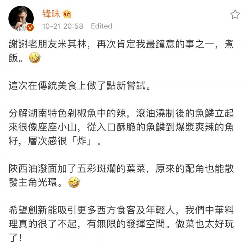 事后,他在微博发文讲解新菜色,并表示:“希望创新能吸引更多西方食客及年轻人,我们中华料理真的很了不起,有无限的发挥空间。做菜也太好玩了!”