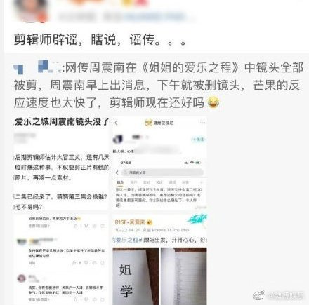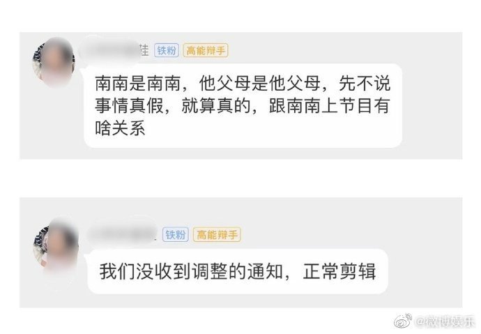 对此,一位疑似是《姐姐的爱乐之程》的剪辑师上线辟谣,表示并没有收到任何调整的通知,节目将会正常剪辑,而且“南南是南南,他父母是他父母,先不说事情真假,就算真的,跟南南上节目有啥关系”。