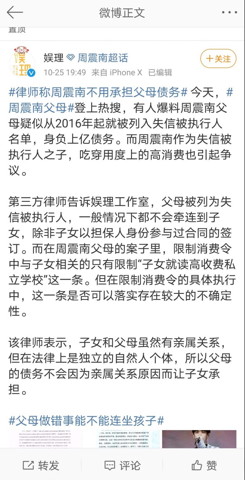此外,有律师告诉中国媒体周震南是不需承担父母债务的。该律师透露“子女和父母虽然有亲属关系,但在法律上是独立的自然人个体,所以父母的债务不会因为亲属关系原因而让子女承担”。