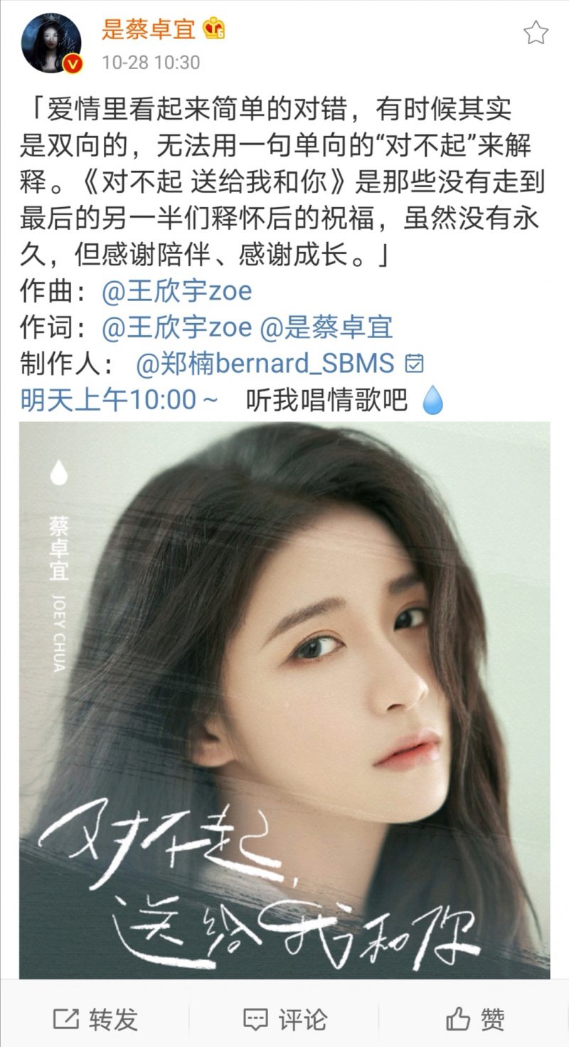 今早,蔡卓宜在微博上贴出一张《对不起 送给我和你》的完整歌词照,并配文“爱情里看起来简单的对错,有时候其实是双向的,无法用一句单向的“对不起”来解释。《对不起送给我和你》是那些没有走到最后的另一半们释怀后的祝福,虽然没有永久,但感谢陪伴、感谢成长。”。