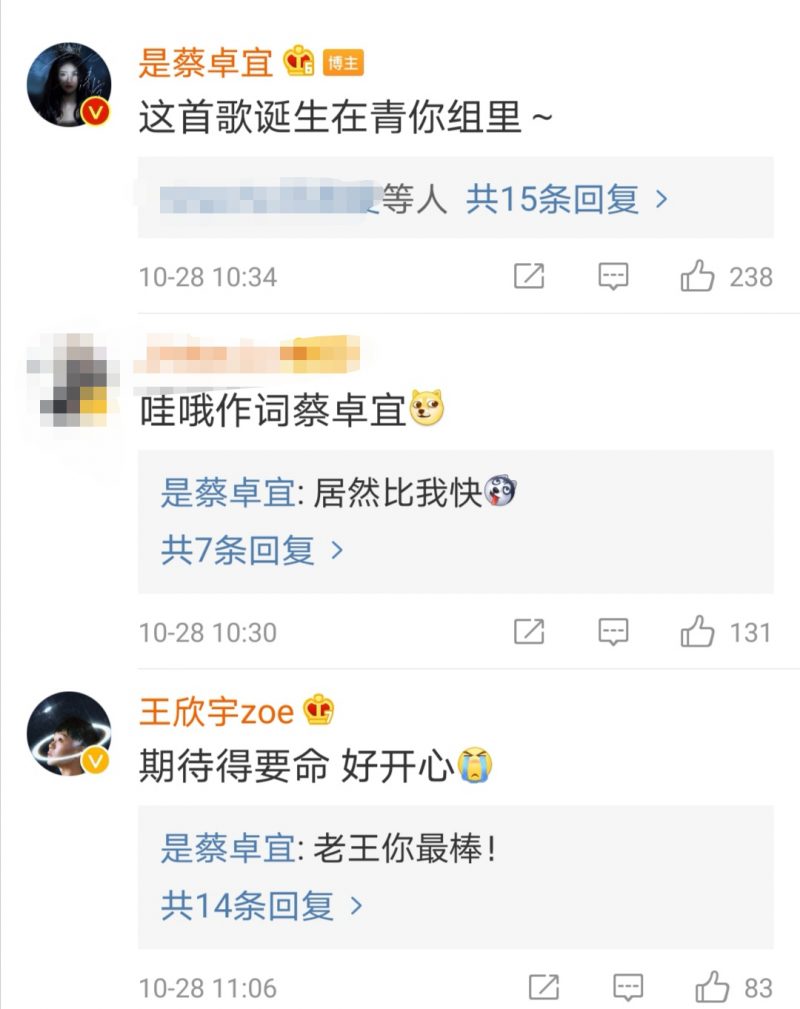 蔡卓宜还在帖文中标记了,昔日在《青春有你2》的战友——王欣宇,原来她是《对不起 送给我和你》的作曲人及作词人,而这首歌也是她们当时在“青你”组里一起创作的;值得一提的是,此次是蔡卓宜首次挑战写词。