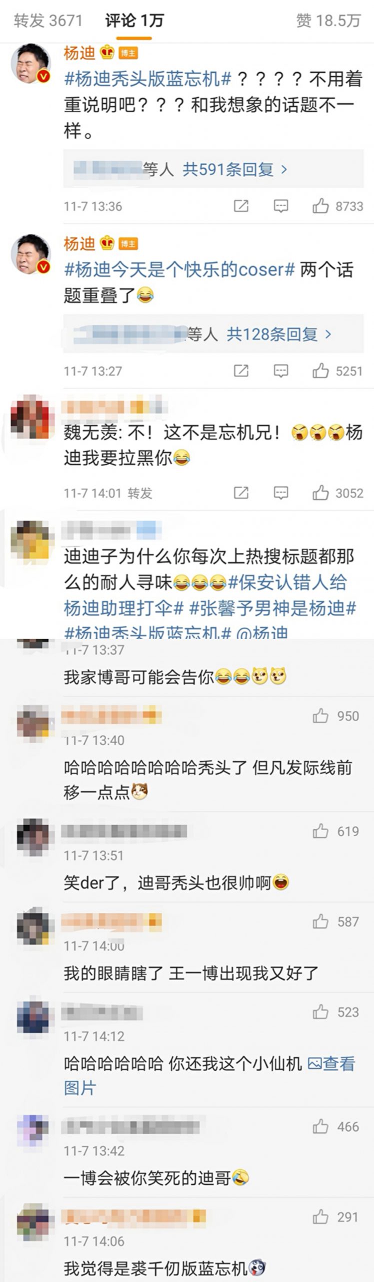 虽然杨迪的母亲说他扮得还算不错,但杨迪却十分嫌弃他的头套,还直言“好难看,王一博肯定会“告”我”,后期甚至还加上“难忘鸡”和“蓝忘机”的对比图,十分搞笑。