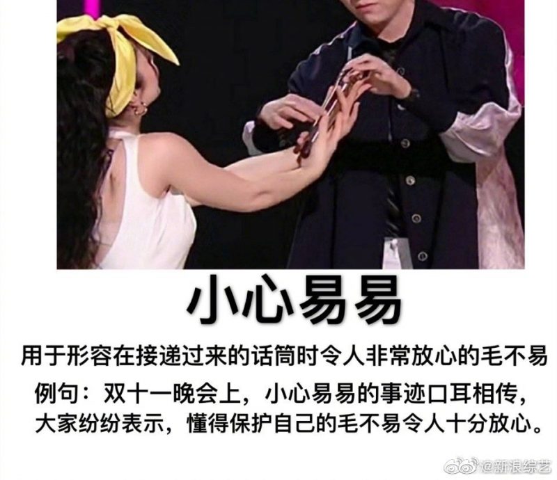 这一系列小心翼翼的举动引得网友一阵爆笑,纷纷表示,“这是被两位姐姐绑架了吗哈哈哈”、“话筒烫手吗”、“哎哟毛毛太可爱了”,甚至有网友研发新词-“小心易易”。