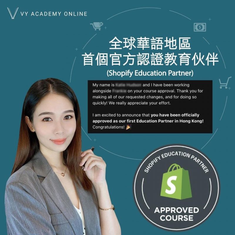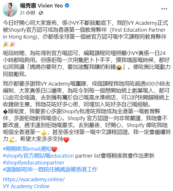 同时,她也在文末表达对VY Academy的团队及Shopify感谢,“我要衷心感谢Shopify批准我们成为全港第一个教育伙伴”,她也承诺未来将会不断改进,务求达到Shopify的要求。