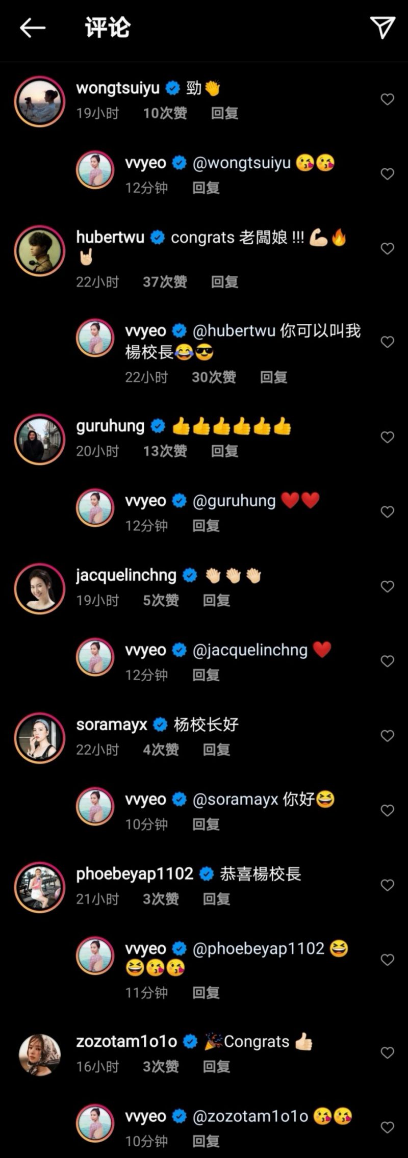 杨秀惠宣布开设学院的消息后,圈内的友人,如黄翠如、洪永城、庄思敏、谭凯琪等人都纷纷在Instagram留言恭喜她,胡鸿钧还在贴文下留言“老板娘!”,杨秀惠则表示“你可以叫我杨校长”。