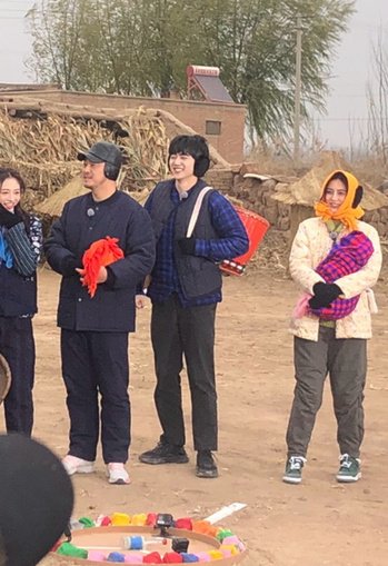 路透图中,除了有李晨、Angelababy、郑凯、沙溢这几位成员外,还有白鹿、R1SE成员焉栩嘉、汪苏泷、张继科及周洁琼。众人都换上乡村style的服装,十分接地气,Angelababy还还装上假肚子,扮演起了孕妇。