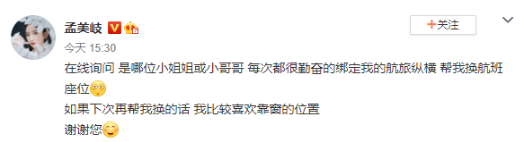 又来了!私生靠非正规途径获取艺人信息,骚扰艺人孟美岐!20日,孟美岐在微博发文称私生擅自调换她的航班座位:“在线询问,是哪位小姐姐或小哥哥,每次都很勤奋地绑定我的航旅纵横,帮我换航班座位”。