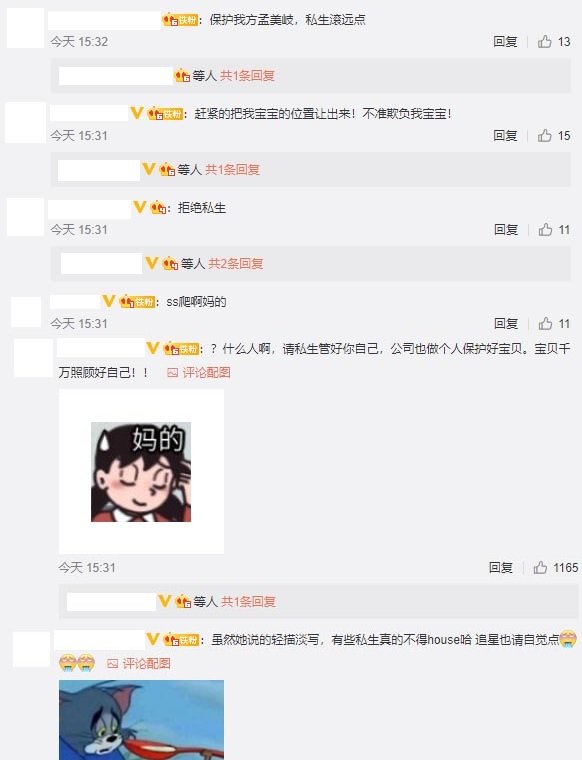 山支大队(孟美岐粉丝昵称)怒让私生注意分寸:“可怜的宝贝,真的不要再这么做了!!!!求求大家”、“私生biss”、“保护我方孟美岐,私生滚远点”。