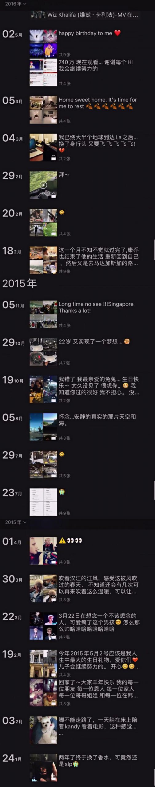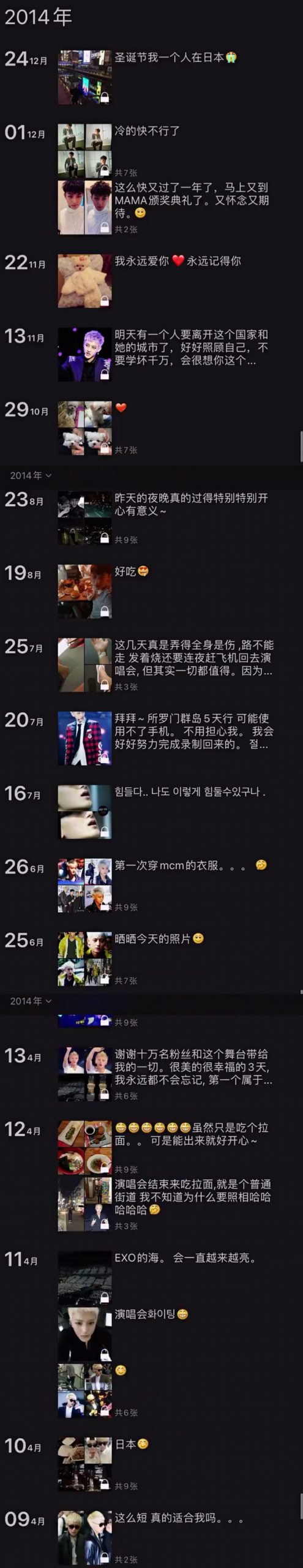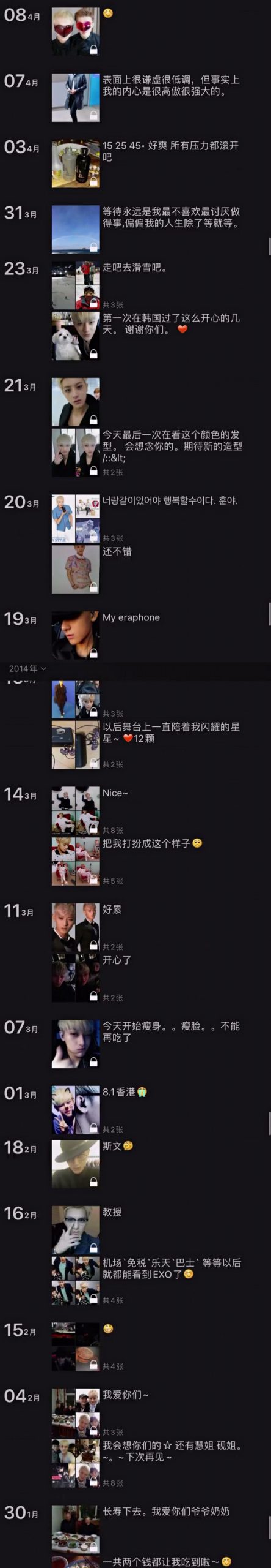 不过从2014年的朋友圈开始,就出现了许多关于当时在EXO中活动的日常,虽然这些内容全都设置了“仅自己可见”,但黄子韬并未把这些属于他的回忆删除。