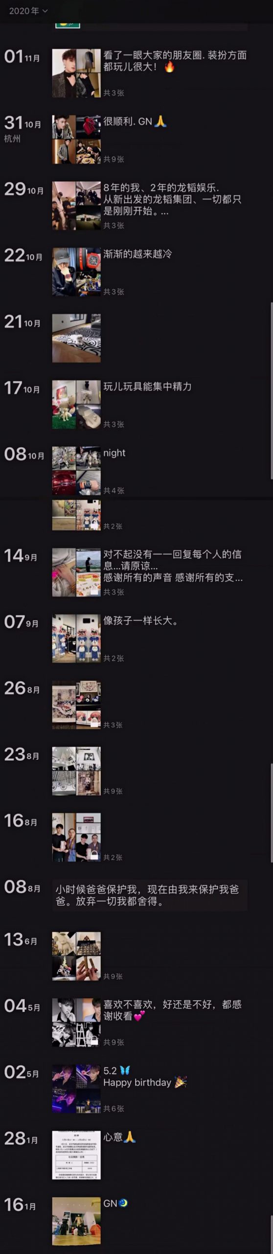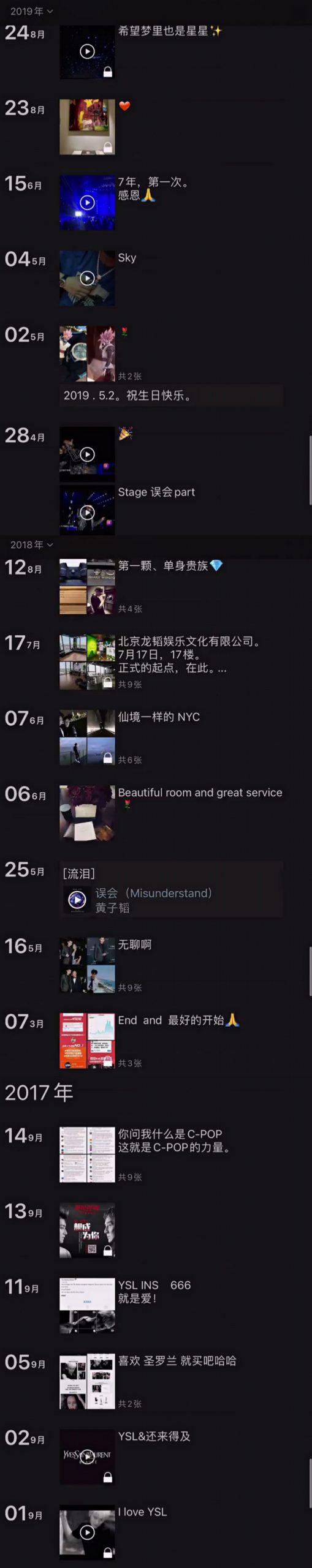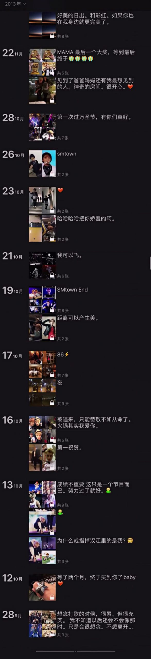 不过从2014年的朋友圈开始,就出现了许多关于当时在EXO中活动的日常,虽然这些内容全都设置了“仅自己可见”,但黄子韬并未把这些属于他的回忆删除。
