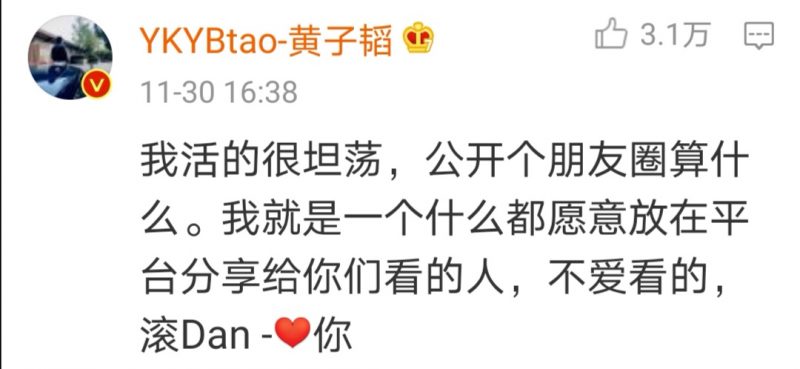 之后黄子韬也在留言区写道“我活的很坦荡,公开个朋友圈算什么。我就是一个什么都愿意放在平台分享给你们看的人,不爱看的,滚Dan”,回怼酸民。