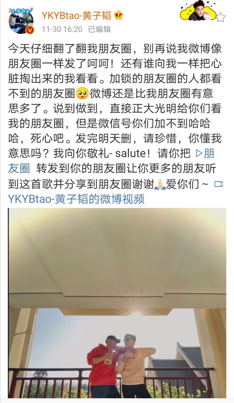 30日,黄子韬在微博上发出一条翻摄手机屏幕的视频,并写道“今天仔细翻了翻我朋友圈,别再说我微博像朋友圈一样发了呵呵!还有谁向我一样把心脏掏出来的我看看。加锁的朋友圈的人都看不到的朋友圈?微博还是比我朋友圈有意思多了。说到做到,直接正大光明给你们看我的朋友圈。 ”