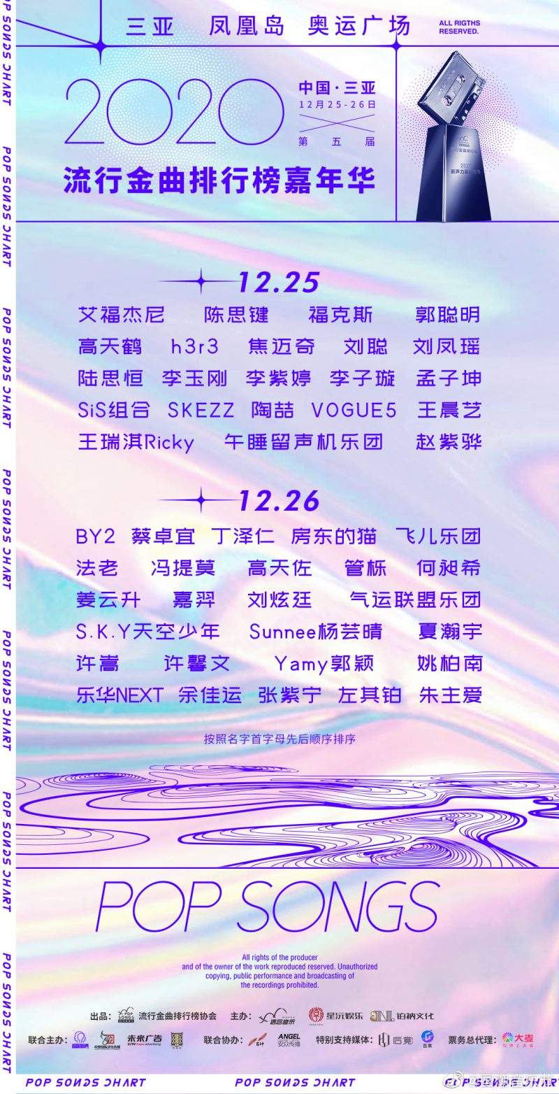 “2020流行金曲排行榜嘉年华”即将于12月25和26日一连两天在中国三亚开启两日狂欢嘉年华模式。日前,官方正式官宣嘉宾阵容,可说是群星璀璨!