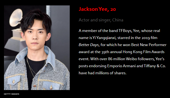 Entertainment娱乐速递 福布斯公布亚洲社交媒体影响力人物TOP100!蔡徐坤、王一博、王嘉尔、易烊千玺等26位华语圈艺人上榜 December 9, 2020 福布斯官方在8日公布了Forbes Asia’s inaugural 100 Digital Stars(亚太地区数字影响力明星榜),评选出100位在亚太地区以其影响力席卷了社交媒体的歌手、乐队和影视明星。 上榜的100人当中共占了26位华语圈知名艺人,分别是易烊千玺、周冬雨、五月天、周杰伦、陈奕迅、蔡依林、宋茜、孙燕姿、吴亦凡、杨幂、杨颖、赵丽颖、王嘉尔、鹿晗、迪丽热巴、王一博、林俊杰、蔡徐坤、邓紫棋、彭于晏、朱一龙、李现、甄子丹、王俊凯、华晨宇、杨紫(顺序按照福布斯官方发布排名)。