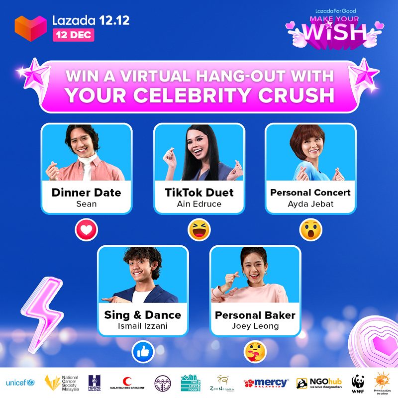 即日起至双12前夕,在LazadaForGood捐款给任何一家非政府组织的所有善心人士都有机会成为Make-Your-Wish 活动五名幸运得奖者的其中一人,并与他们喜爱的本地知名艺人在网上见面。这些非政府组织包括联合国儿童基金会(UNICEF)、大马临终关怀协会(Hospis Malaysia)、马来西亚医疗援助协会(Mercy Malaysia)等组织。幸运儿将有机会与大马名人在线上进行一对一的互动,包括与Ain Edruce玩转TikTok,与Ayda Jebat 合唱,欣赏Ismail Izzani 的个人演出,免费与Sean Lee共进晚餐,以及品尝 Joey Leong 亲自准备的甜点。五位本地知名艺人志愿与LazadaForGood合作,并希望在这个感恩施赠的季节回馈社会,帮助弱势群体。