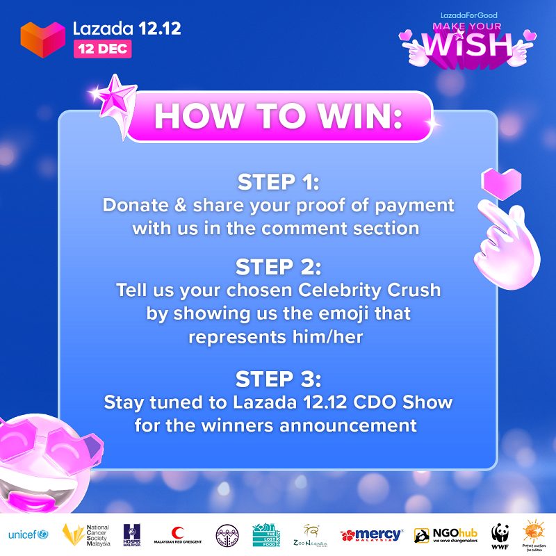 欲参加活动,只需完成以下3个简单步骤。首先,在Lazada马来西亚脸书专页的 Make-Your-Wish 活动帖文留言区分享LazadaForGood捐款截图和订单号码;第二,选择期待与之线上互动的艺人;最后,于12月11日晚上9点至11点,在Lazada应用程式的LazLive收看双12年终大促销首席促销员CDO直播秀 ,等待现场公布幸运得奖者名单。